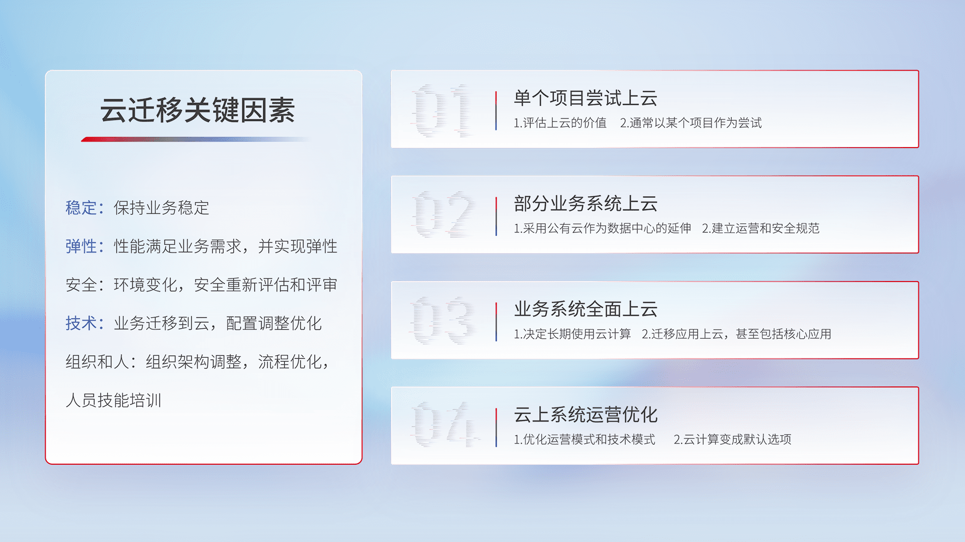 结合实际业务,,,,从规划设计、、、云平台选型、、、云原生改造、、、、数据迁移、、、、集成交付,,迁移全过程为客户识别最佳上云路径,,做好风险识别管理,,设计网络架构、、、身份权限、、、、安全审计合规、、操作审计、、、、日志审计、、、监控告警策略、、、多站点容灾设计等,,,对云上基础设施进行整体规划,,,提升IT治理水平,,,以满足弹性、、、、高可用、、高性能的需求。。